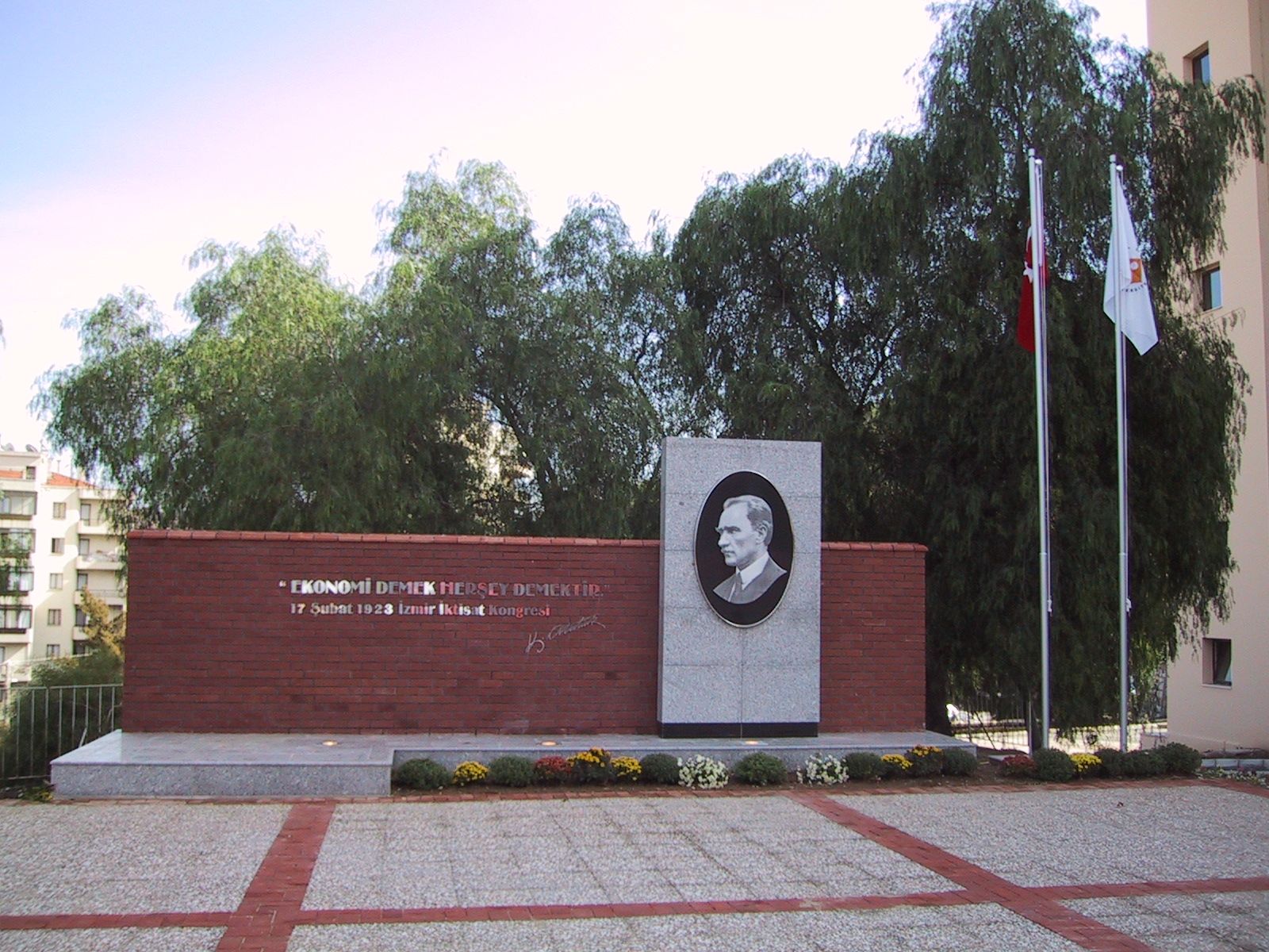 İzmir Ekonomi Üniversitesi bahçesinde bulunan Atatürk anıtı üzerinde, Gazi Mustafa Kemal Atatürk'ün fotoğrafı, alüminyum malzeme üzerine asit indirme tekniği ile imal edilmiştir ve geleceğimize yön veren sözünü içeren harfler, krom malzemeden kesilerek imal edilmiştir. Anıtın yanında yine krom malzemelerden, Türk bayrağı direği ve kurum bayrağı direği imal edilerek konumlandırılmıştır.