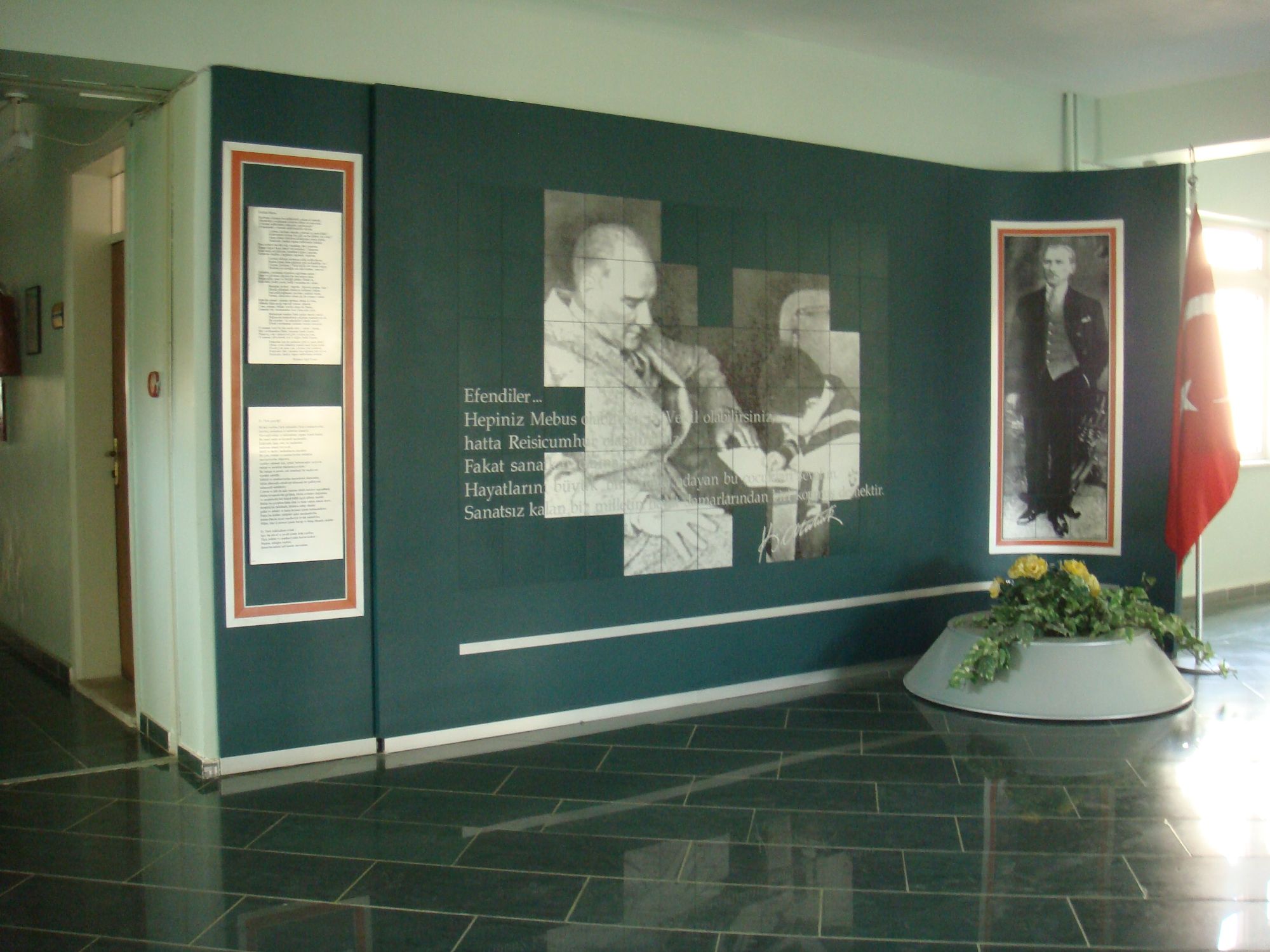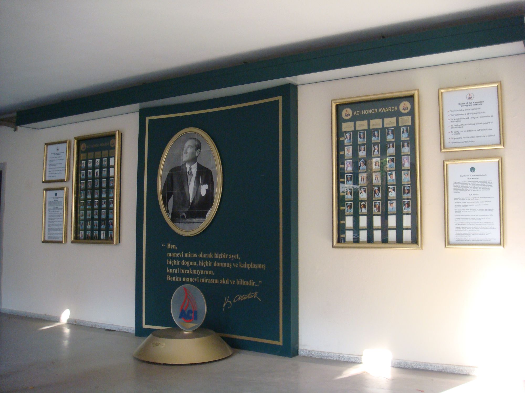 Özel İzmir Amerikan Kolejinde bulunan Atatürk köşesi, Gazi Mustafa Kemal Atatürk'ün fotoğrafı ve geleceğimize yön veren sözleri olmak üzere anı köşesi olarak tasarlanmıştır. Anı köşesi panosunun iskeleti, demir konstrüksiyon ve üzeri renklendirilmiş alüminyum malzemeden imal edilmiştir. Panonun tavanla birleşim noktasında tüm duvar pano parçalarını altında barındıracak uzunlukta led ışık bantı ile bir bütün olarak üretilmiştir.