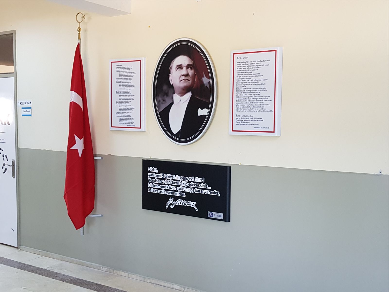 İzmir Torbalı Dağkızılca Ortaokulunda uyguladığımız standart Atatürk köşesi tasarımımız, İzmir'de bazı kamu kurumlarının, anaokul, ilkokul, ortaokul ve lise gibi okullara bağışta bulunduğu "Atatürk Anıtı ve Anı Köşesi Bağış Projesi" kapsamında yüklenicisi olduğumuz üretimimizdir. Dağkızılca Ortaokulu Atatürk köşesi görseli bir örnektir.